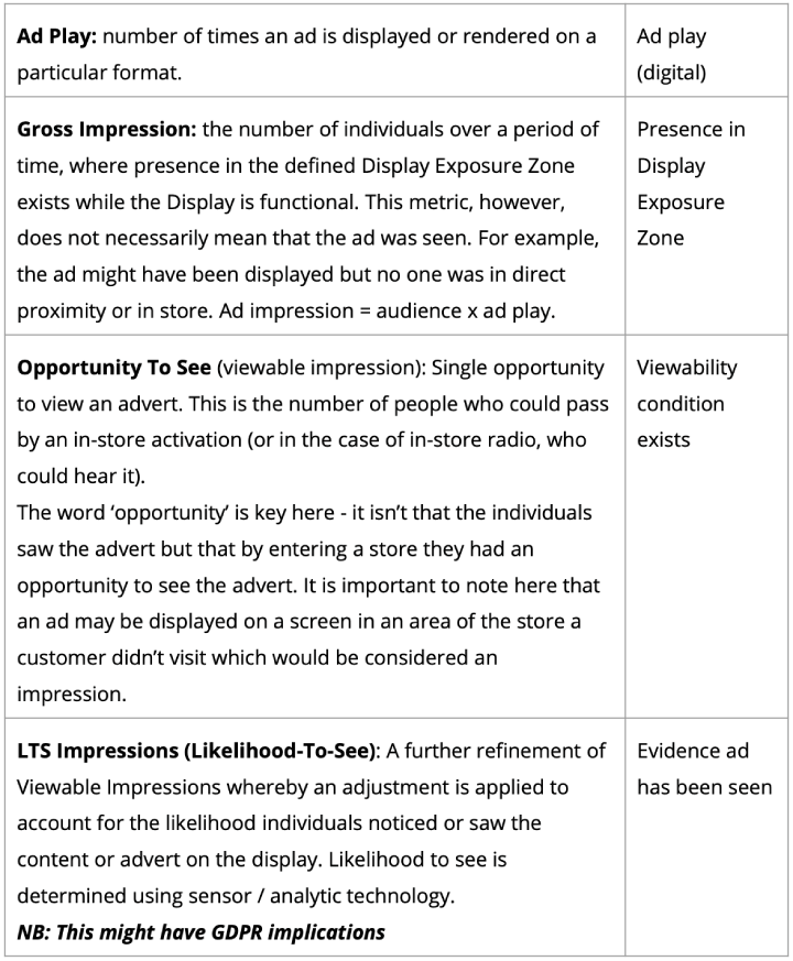 Jak uvádí IAB ve standardu, jedná se o příležitost k tomu, aby zákazník viděl naši reklamu. Samotná definice ale přímo počítá s tím, že kvalita měření se může mezi jednotlivými provozovateli řádově lišit; někdo může disponovat senzory a u konkrétní obrazovky může počítat zákazníky, kteří skutečně prošli kolem (v rámci možností super), zároveň ale konkurent může počítat zákazníky na vstupu a u každého "předpokládat", že měl možnost reklamu během své návštěvy vidět (to je míň super).